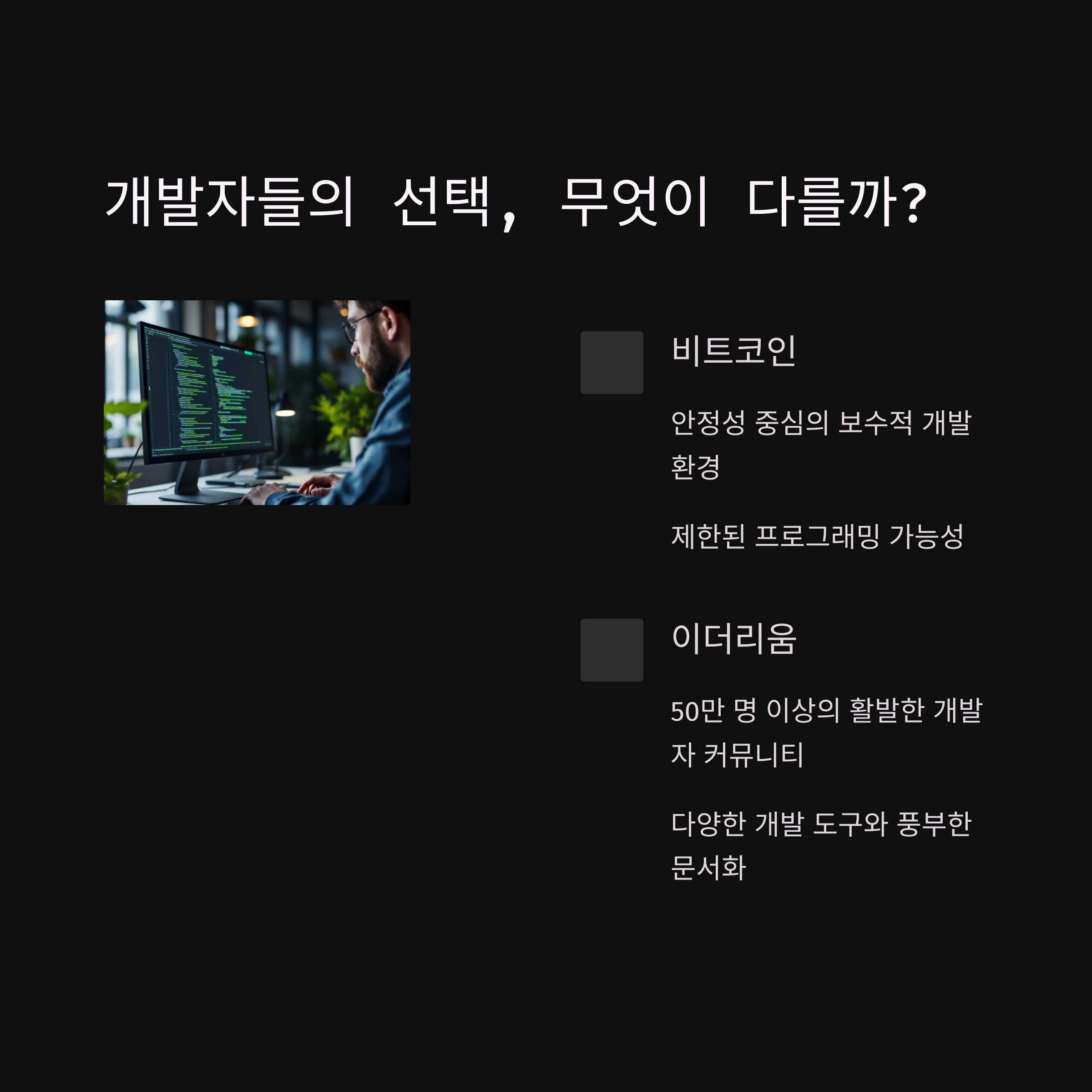 이더리움은 DeFi, NFT, DAO 등 혁신적 프로젝트가 빠르게 생겨나는 공간이며 개발자 활동량도 비트코인보다 많습니다. 오픈소스 툴킷과 명확한 문서화도 개발자 유입에 기여하고 있죠. 반면, 비트코인은 금융 보안성과 탈중앙 철학을 따르는 개발자에게는 여전히 매력적입니다.