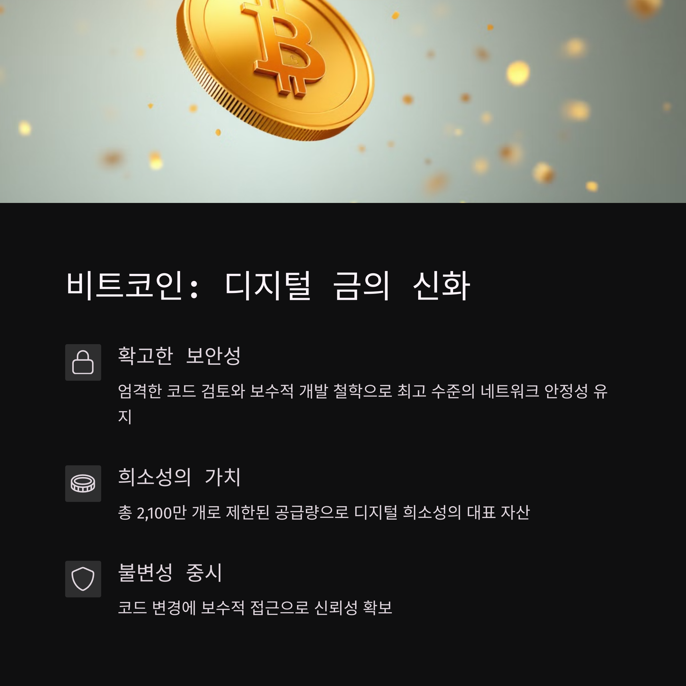 | 비트코인 특징 | 보안성과 탈중앙화에 집중된 구조, 보수적 개발 환경 |