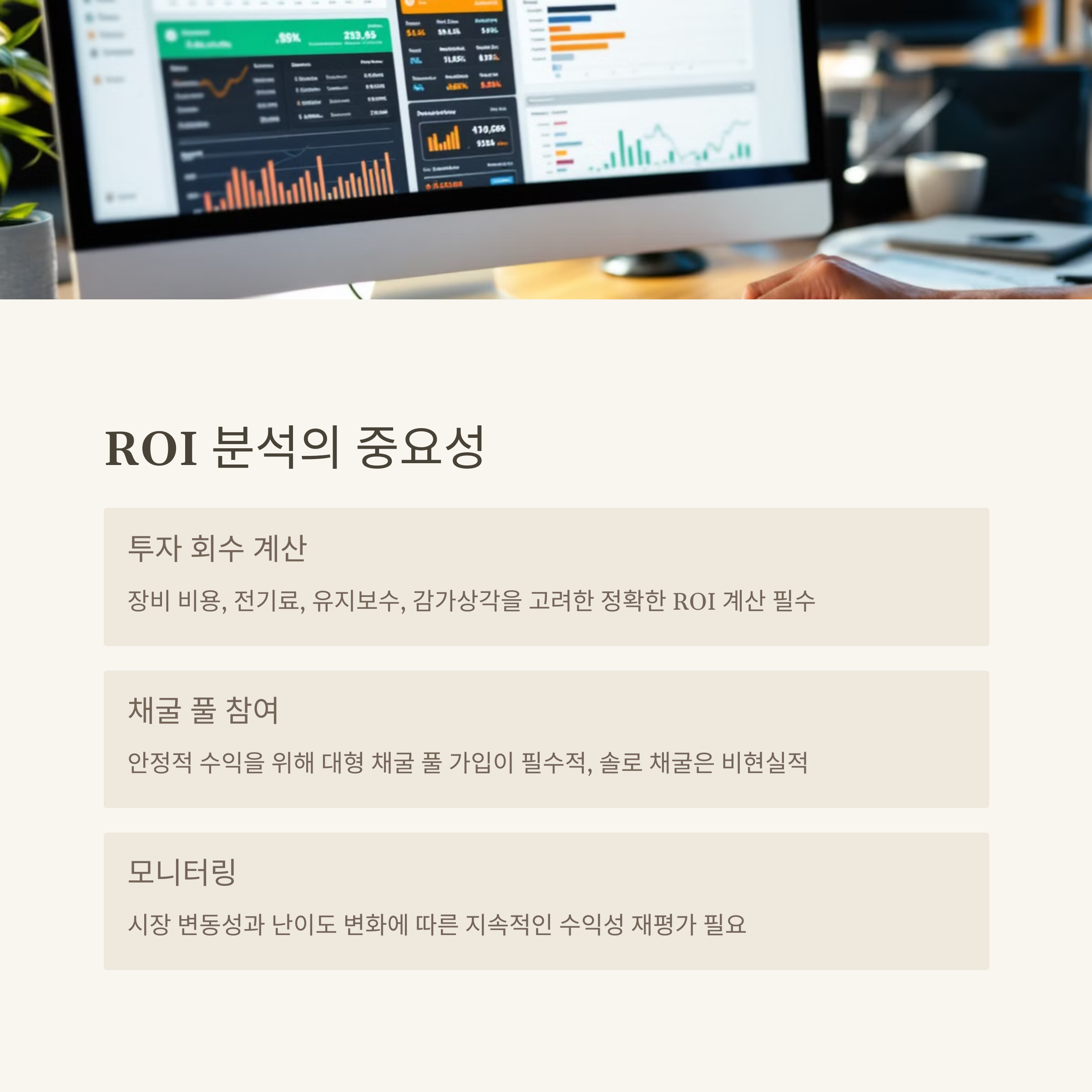 개인 채굴을 고민한다면 전기료 단가, 장비 소음 관리, 냉각 시스템까지 확인해야 합니다. 수익률 시뮬레이션 사이트를 활용해 현실적인 수익성 분석을 먼저 해보는 것이 좋습니다.