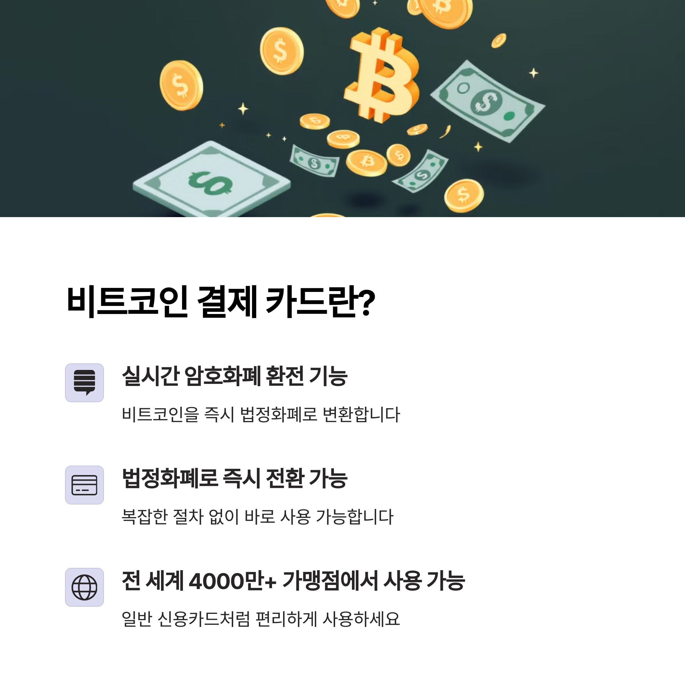 | 주요 기능 | 실시간 암호화폐 환전, 포인트 대신 BTC 캐시백 제공, 글로벌 결제 지원 |