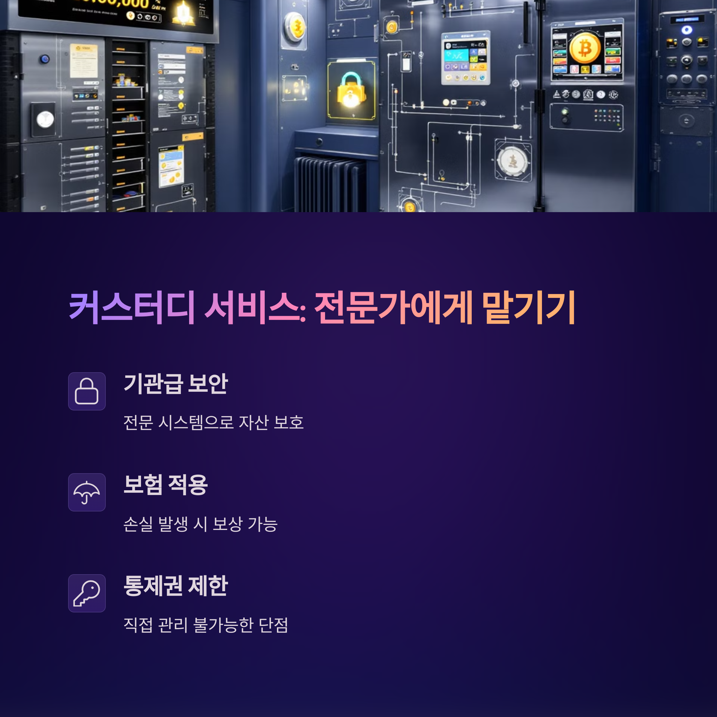 두 번째 방법은 커스터디 서비스를 이용하는 것입니다. 은행이나 전문 수탁업체가 암호화폐를 대신 보관하며, 기업, 기관 투자자들이 선호합니다. 강력한 보안과 보험 적용이 장점이지만, 개인 사용자에겐 다소 불편할 수 있습니다.