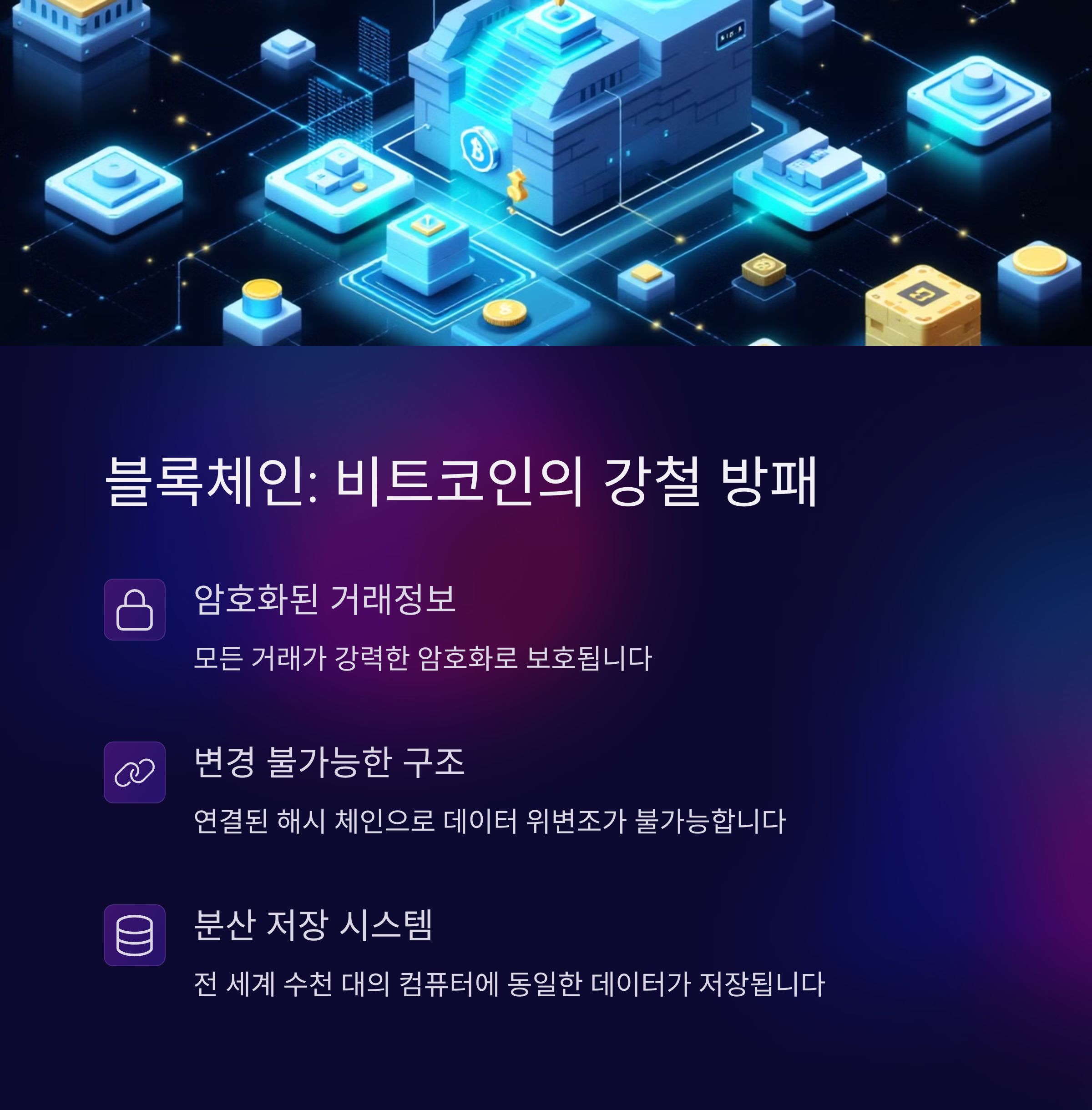 | 비트코인 보안 구조 | 작업증명(PoW), 난이도 조절, 블록체인 암호화, 분산 원장 |