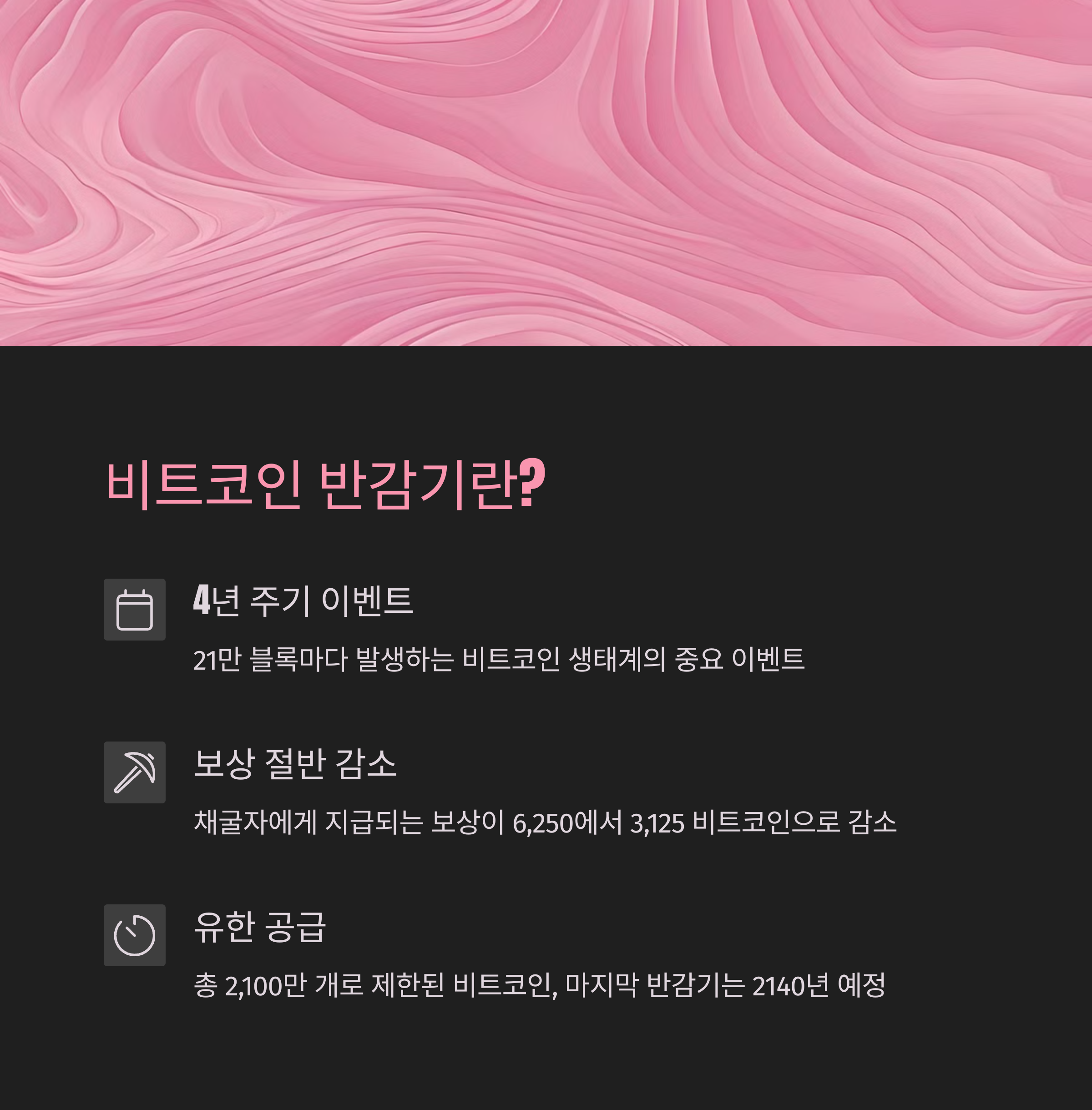 | 반감기 정의 | 약 4년마다 블록당 채굴 보상이 절반으로 줄어드는 비트코인의 설계 원리 |
