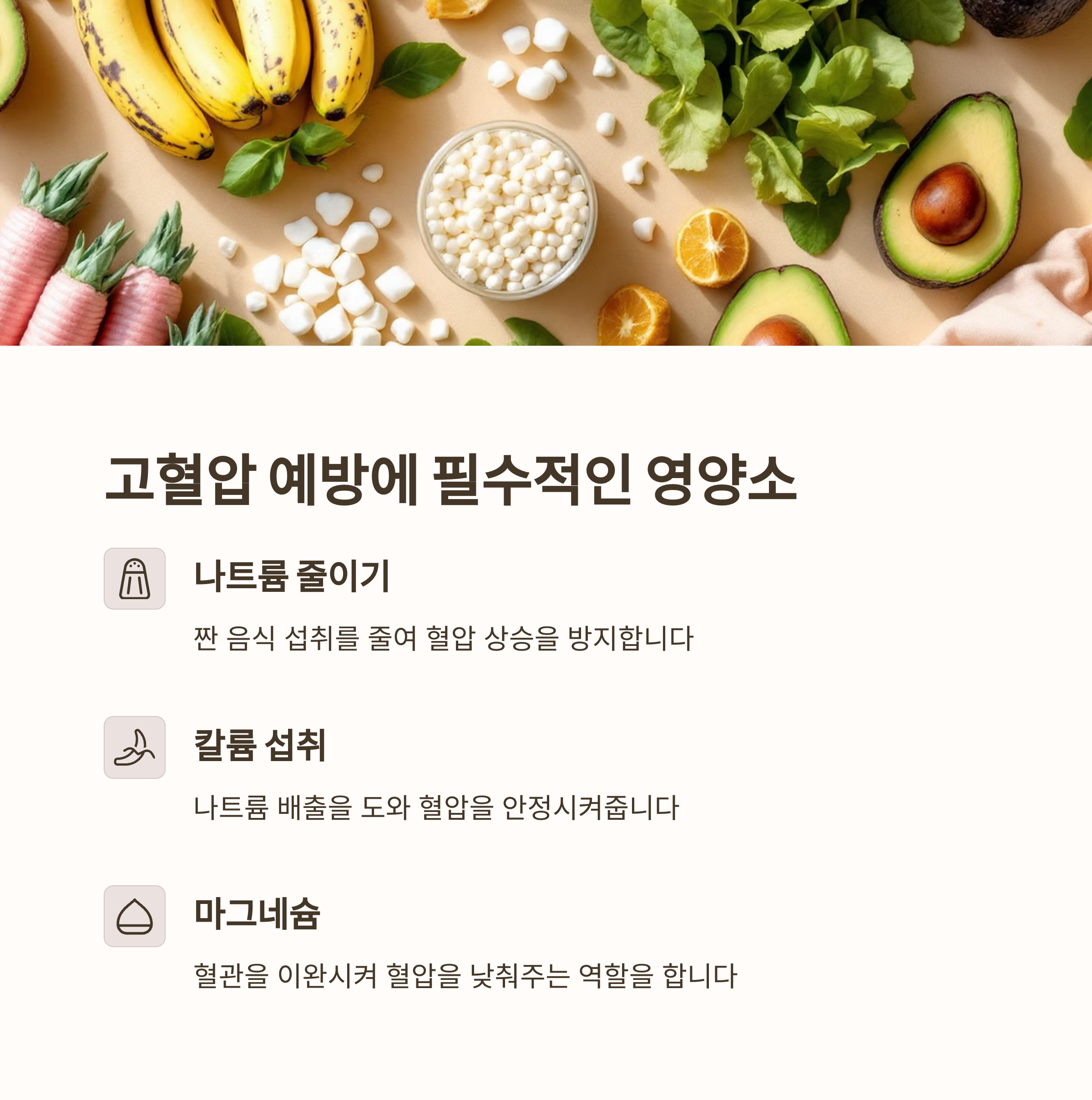 "매일 한 가지씩만 꾸준히 먹어도, 혈압 관리에 큰 도움이 됩니다."