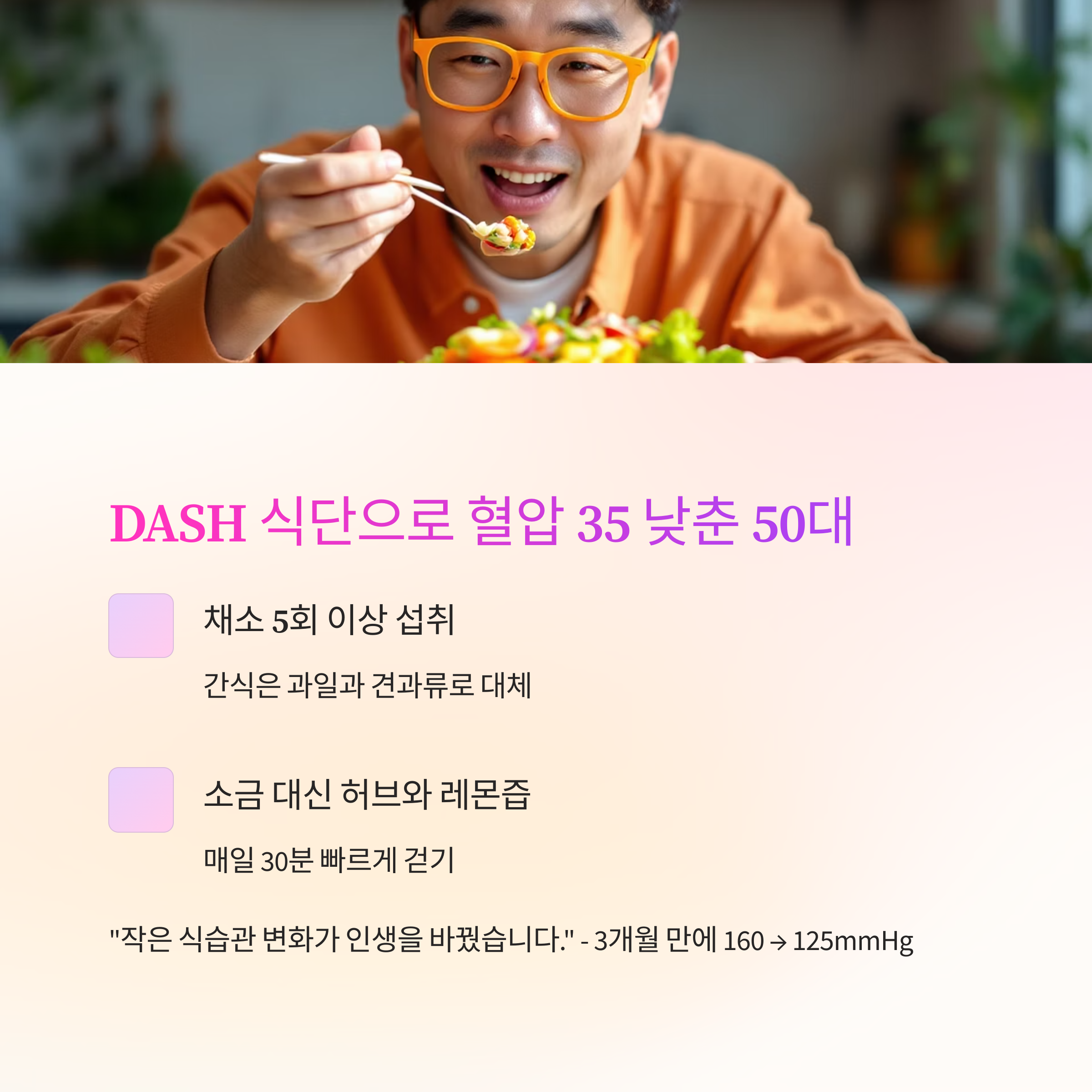 | ① 직장인 이씨 | 3개월 | DASH 식단 + 걷기 | 160 → 125 |